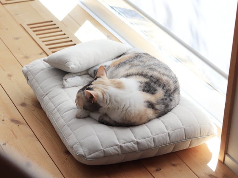 「ドライコットン ペットベッド」は、同ブランドで人気の冷感寝具シリーズの素材を使用しています。表地はコットン100%ながら高い接触冷感機能を備え、暑さに弱い猫や小型犬の夏場の居場所として適しています。あごを乗せやすい枕付きの形状で、ミントとグレーの2色展開です。