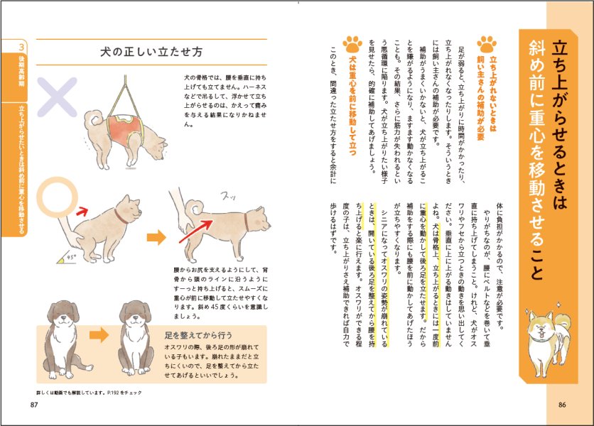誌面では、健康寿命をのばすためのアンチエイジングや、東洋医学に基づくケア、立ち上がりや寝返りの補助といった実践的な介護メソッドを紹介しています。特に、飼い主が精神的・体力的負担を抱えすぎないよう「無理なく続けられる」心構えを重視した内容となっているのが特徴です。