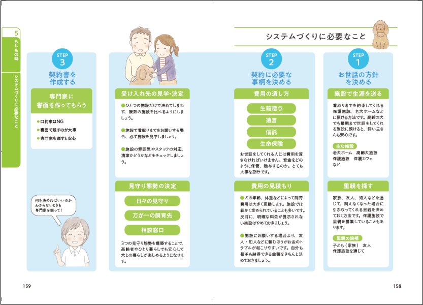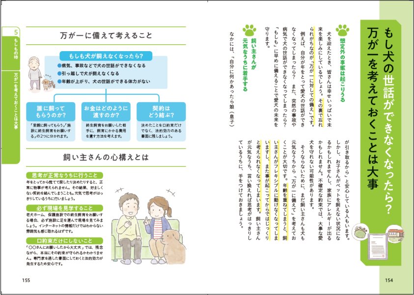 また、介護テクニックにとどまらず、飼い主に万が一のことがあった際の愛犬の預け先や費用の準備といったライフプランに関する情報も盛り込まれています。各章の冒頭にはねこまき氏によるマンガが掲載されており、シニア期特有の状況を視覚的に理解できる工夫が施されています。
