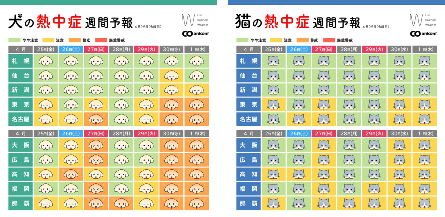 アニコム、犬と猫の熱中症予防「熱中症週間予報」配信開始。4-5月から早めの対策を喚起