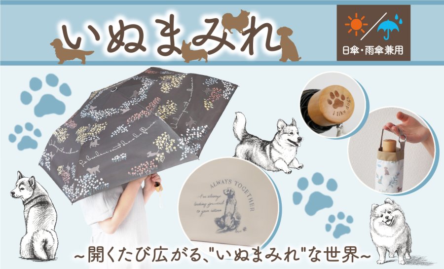 サントス、犬のデザインが散りばめられた晴雨兼用折りたたみ傘「いぬまみれ」